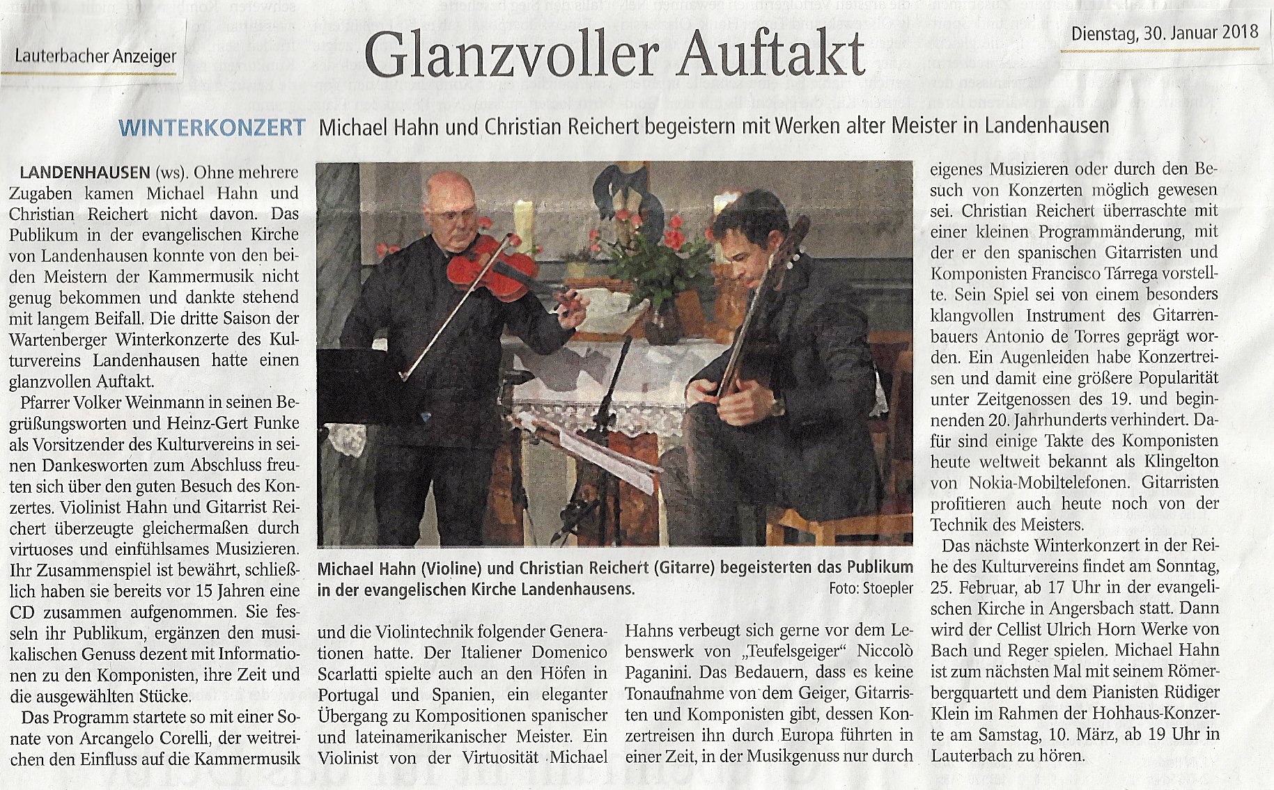 Am Sonntag, 28. Januar, um 17:00 Uhr brachte der Gitarrist Christian Reichert und der Geiger Michael Hahn ein unterhaltsames Programm mit italienischen, spanischen und lateinamerikanischen Werken in Landenhausen. Nach seinem begeisternden Erfolg in der ersten Konzertsaison mit dem international bekannten und gefragten Gitarrenvirtuosen Christian Reichert.