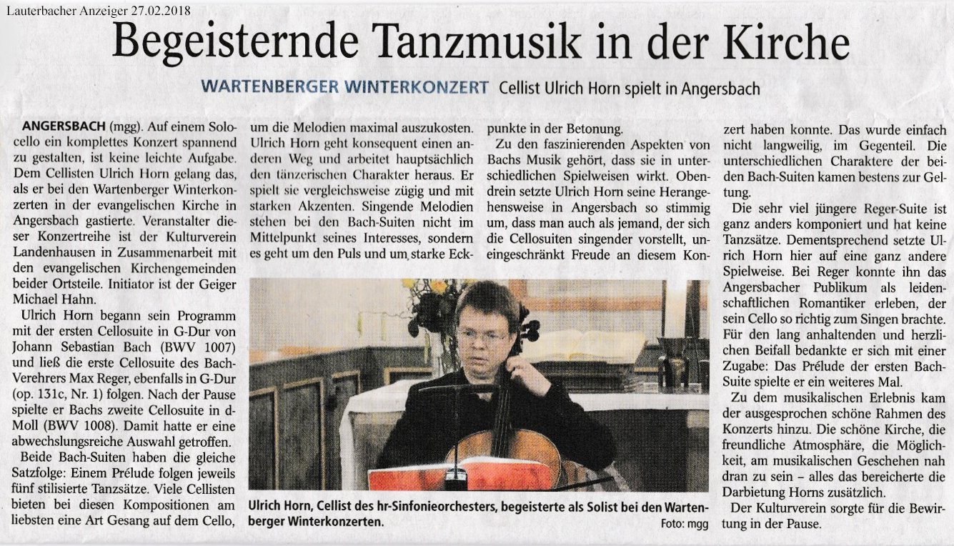 25.02.2018 Das letzte WinterKonzert in Angersbach mit dem Cellisten Ulrich Horn war sehr beeindruckend. Leider herrschte an diesem Tag eine extreme Kälte, so dass sich viele Leute nicht überwinden konnten, ihr warmes Zimmer zu verlassen. Aber, sie haben etwas verpasst! Herr Horn war vor kurzem auch bei Alsfeld Musik Art (Barockmusik) zu hören.