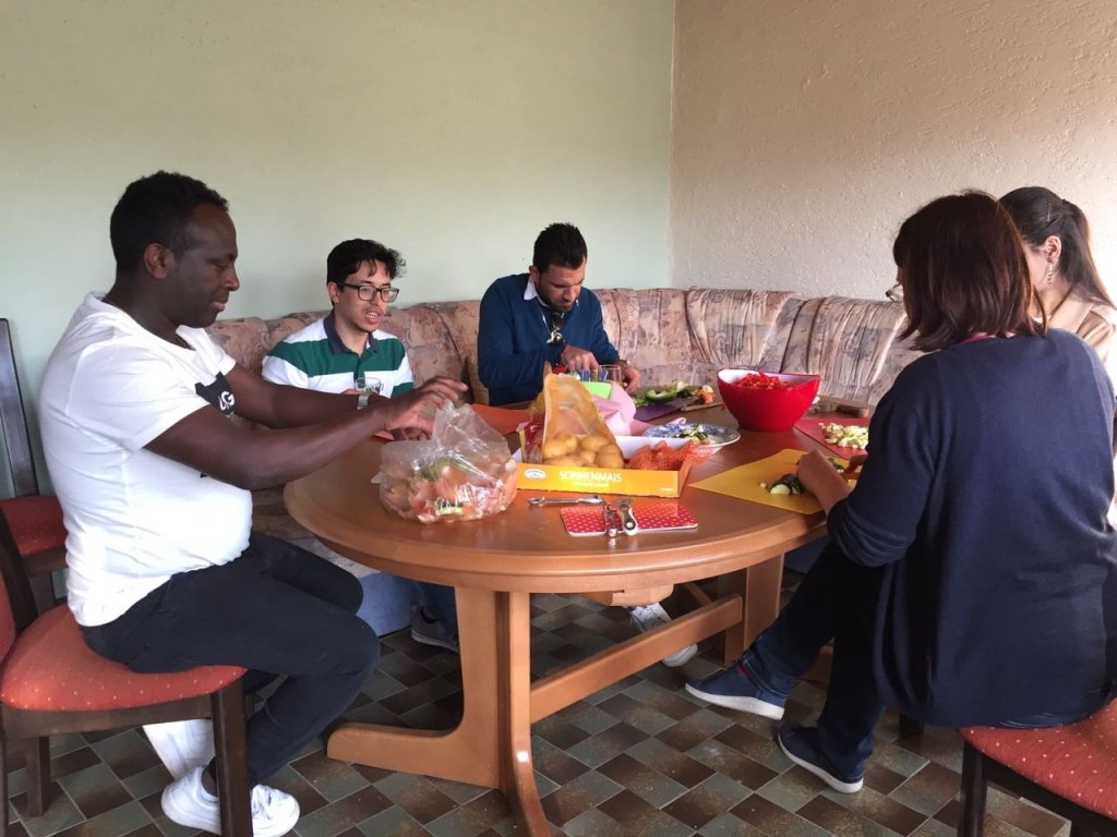 Unser „Chili con carne“ hat allen gut geschmeckt und ein Nachtisch rundete das Menü ab. Bei den anschließenden Gesprächen kam ein reger Austausch zustande, wobei wir alle überrascht waren, wie gut die Teilnehmer die deutsche Sprache bereits beherrschen und wie sie das Leben in unserer Mitte erleben. Berührend die Geschichten und das Erleben jedes Einzelnen.